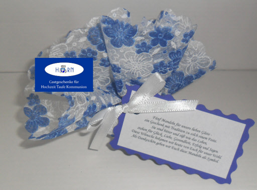 Gastgeschenke Hochzeit Chiffonsäckchen befüllt mit 5 weißen Hochzeitsmandeln dunkelblau